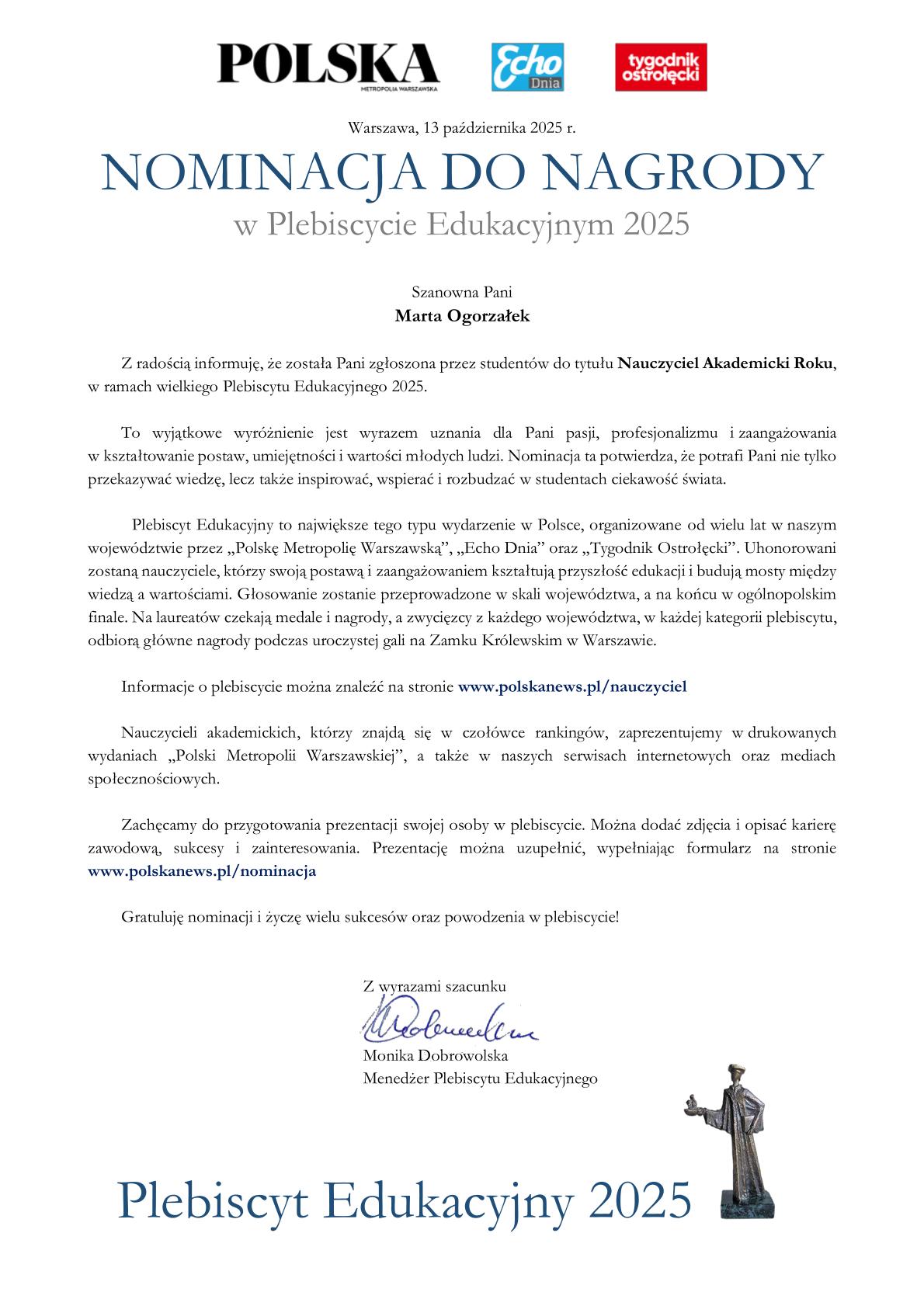 zostały zgłoszone przez Studentów do tytułu Nauczyciel Akademicki Roku w ramach wielkiego Plebiscytu Edukacyjnego 2025.