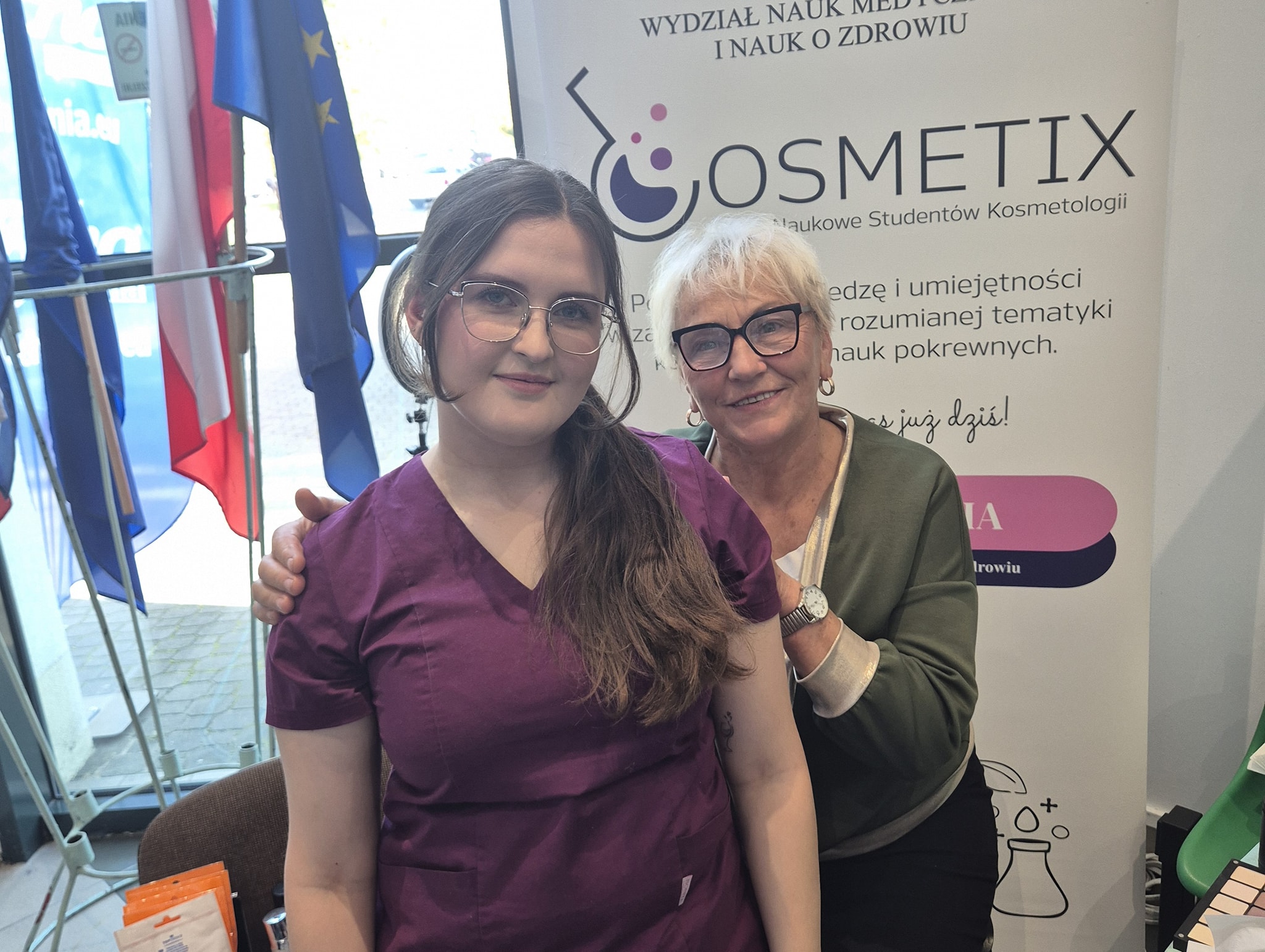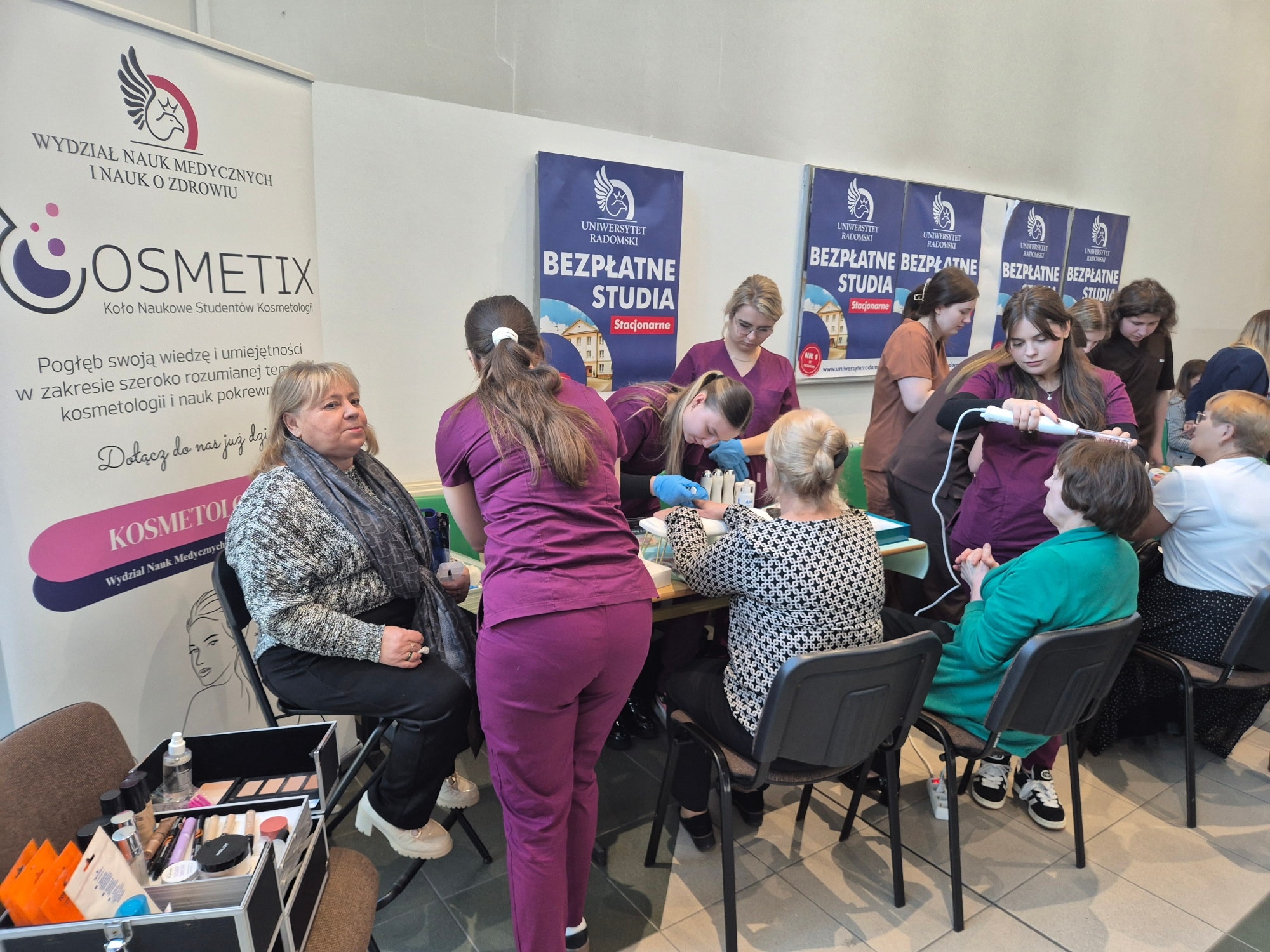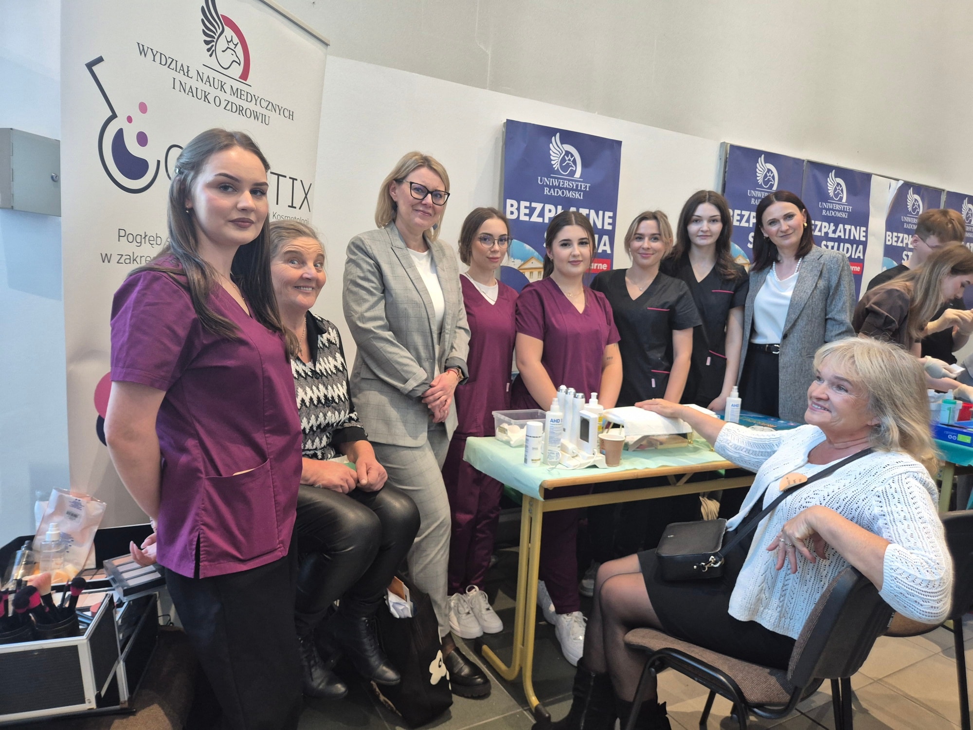 23 października 2025 roku, w Auli Głównej Uniwersytetu Radomskiego im. Kazimierza Pułaskiego odbyło się I Radomskie Forum Seniora – wyjątkowe wydarzenie poświęcone najstarszym mieszkańcom naszego regionu. Z Katedry Kosmetologii został wygłoszony, przez prof. dr hab. inż. Tomasza Wasilewskiego, interesujący wykład pt. „Deklaracje marketingowe kosmetyków a rzeczywistość”. Natomiast, Studentki kierunku Kosmetologia wraz z Członkiniami koła „Cosmetix” przygotowały stoisko pełne atrakcji. Seniorzy mogli skorzystać z diagnostyki stanu skóry, zabiegu na skórę głowy i włosów za pomocą darsonvalu oraz regeneracyjnego zabiegu na płytkę paznokcia – manicure japoński. Ponadto, wykonywany był również makijaż dzienny dla cery dojrzałej.