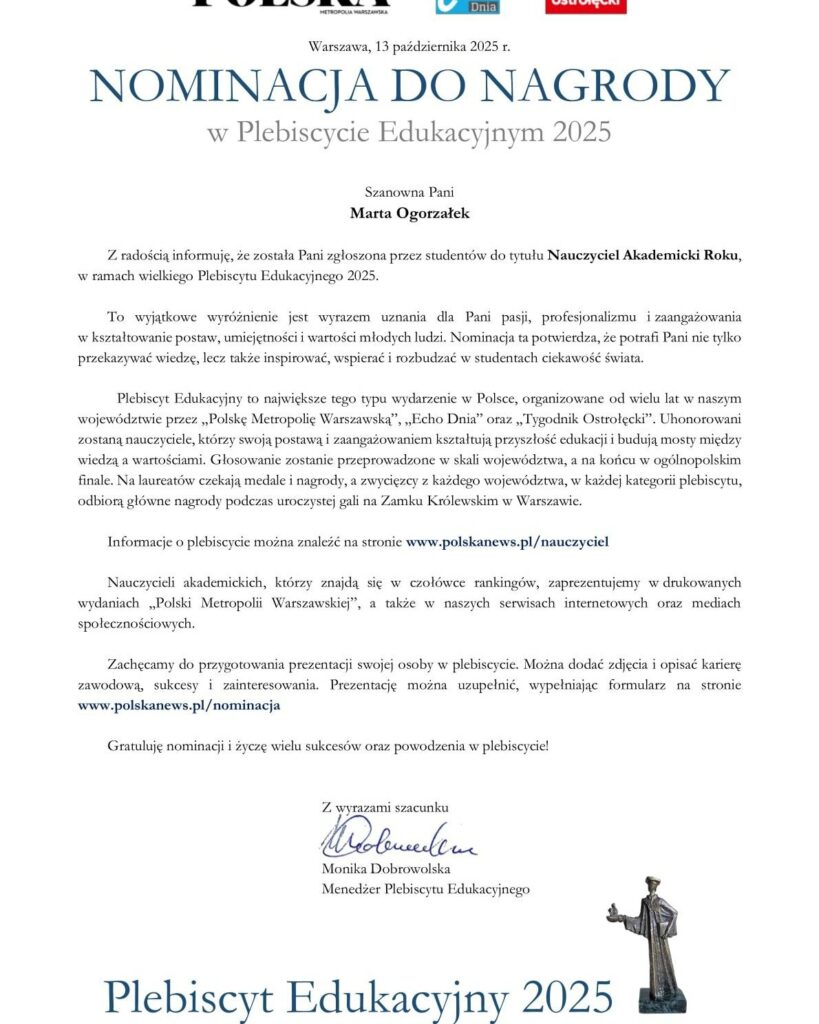 Dr inż. Marta Ogorzałek z nominacją do tytułu Nauczyciel Akademicki Roku w ramach Wielkiego Plebiscytu Edukacyjnego 2025