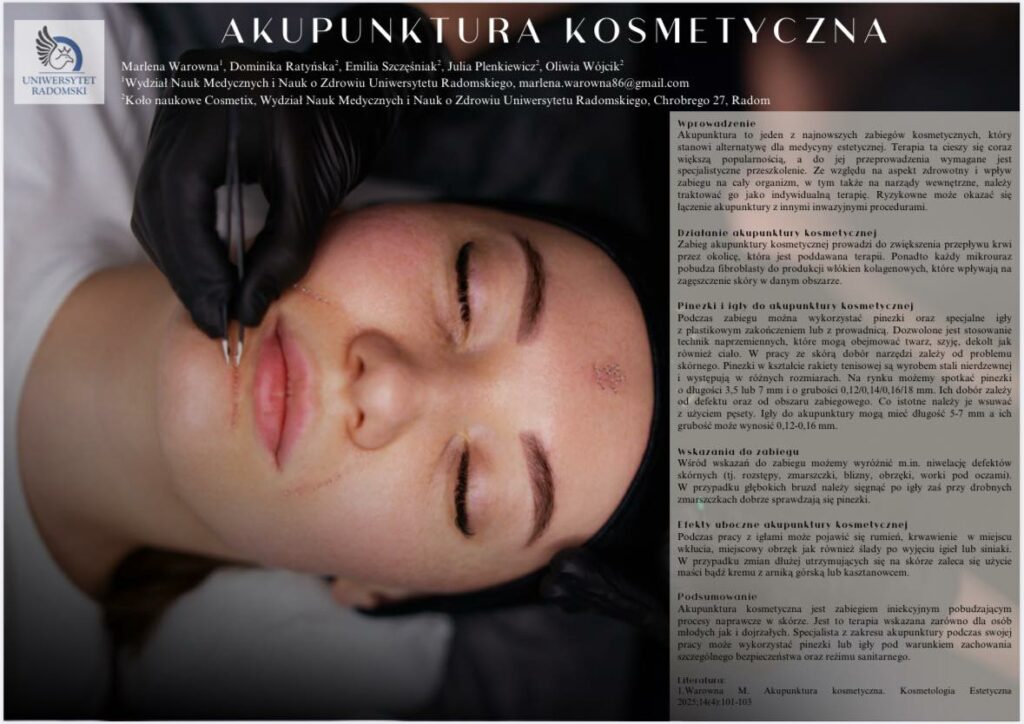 Dnia 22.11.2025r. odbyła się Ogólnopolska Konferencja Naukowa ,,e-Factory of Science”, na której studentki II roku Kosmetologii z koła Cosmetix brały czynny udział. Pani Dominika Ratyńska, Emilia Szczęściak, Julia Plenkiewicz oraz Oliwia Wójcik przygotowały poster naukowy poświęcony Akupunkturze kosmetycznej. Opiekunem naukowym była dr Marlena Warowna.