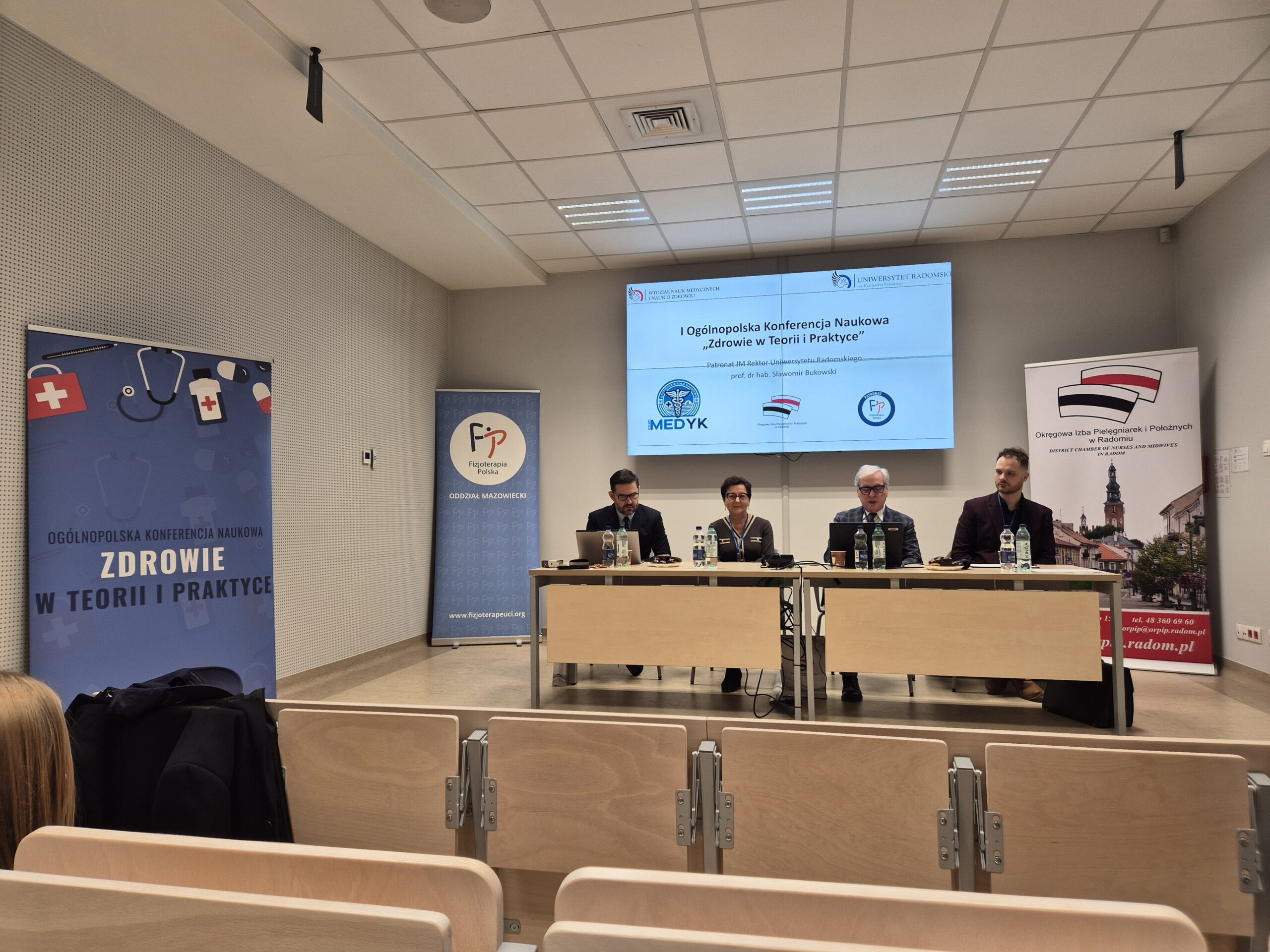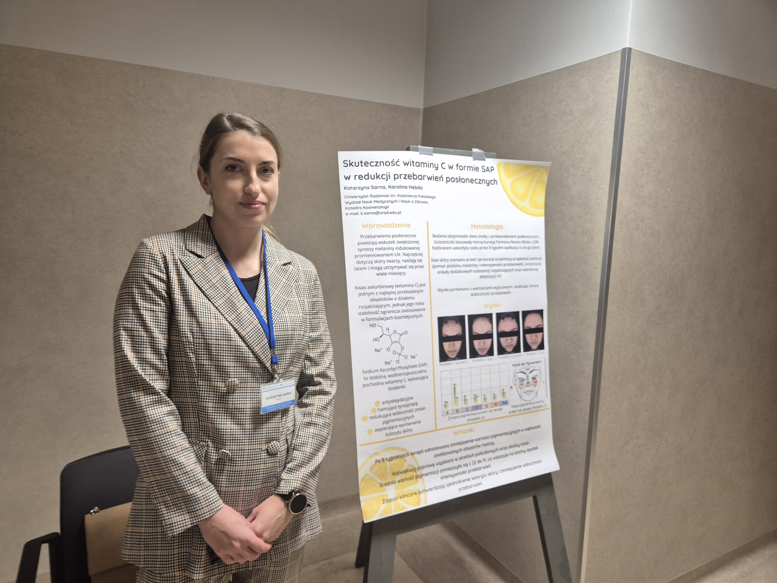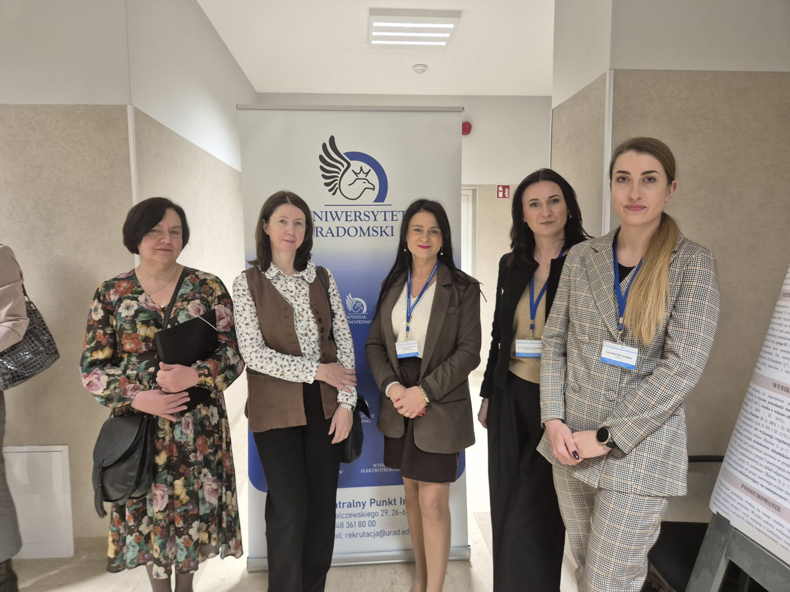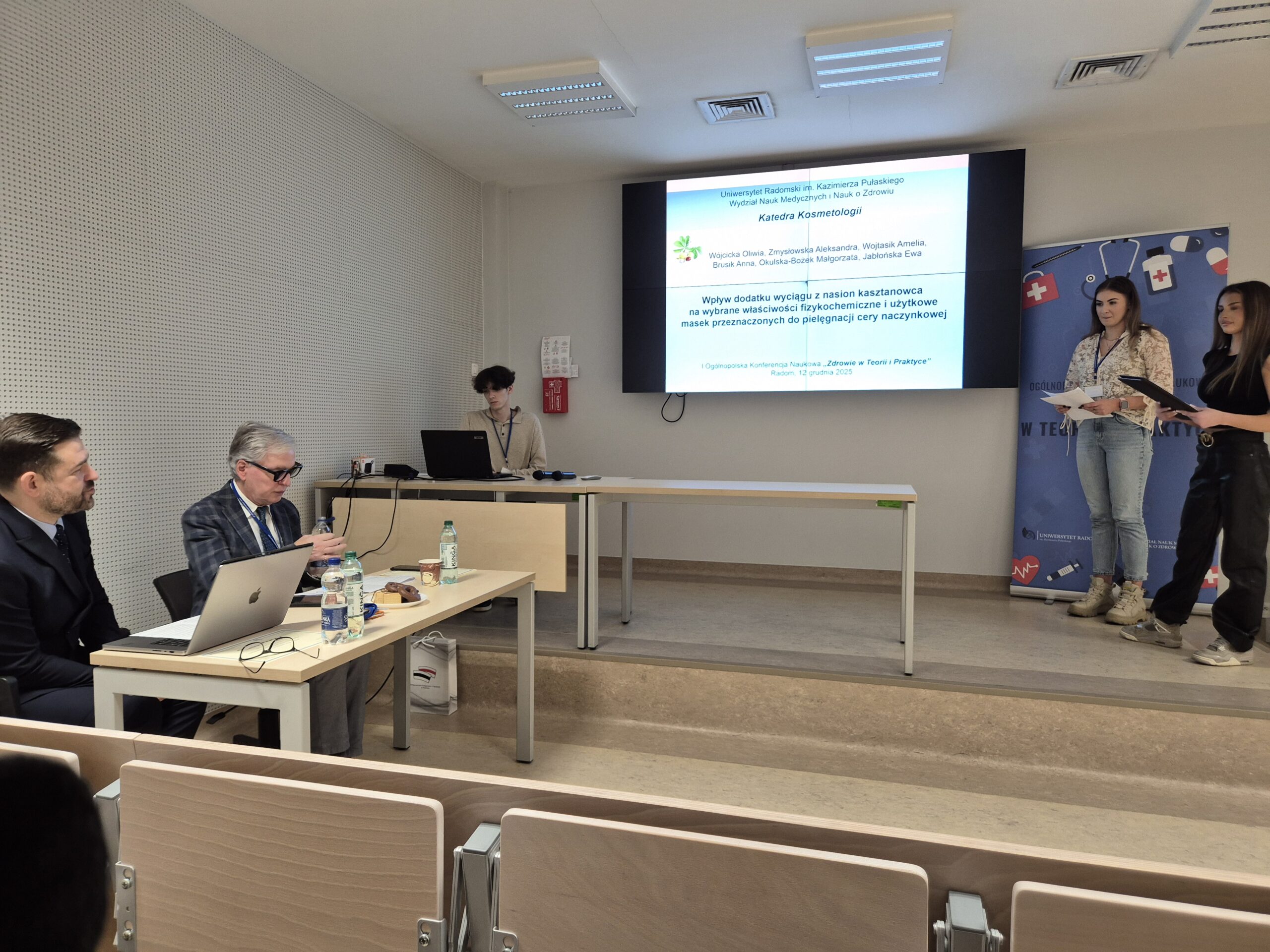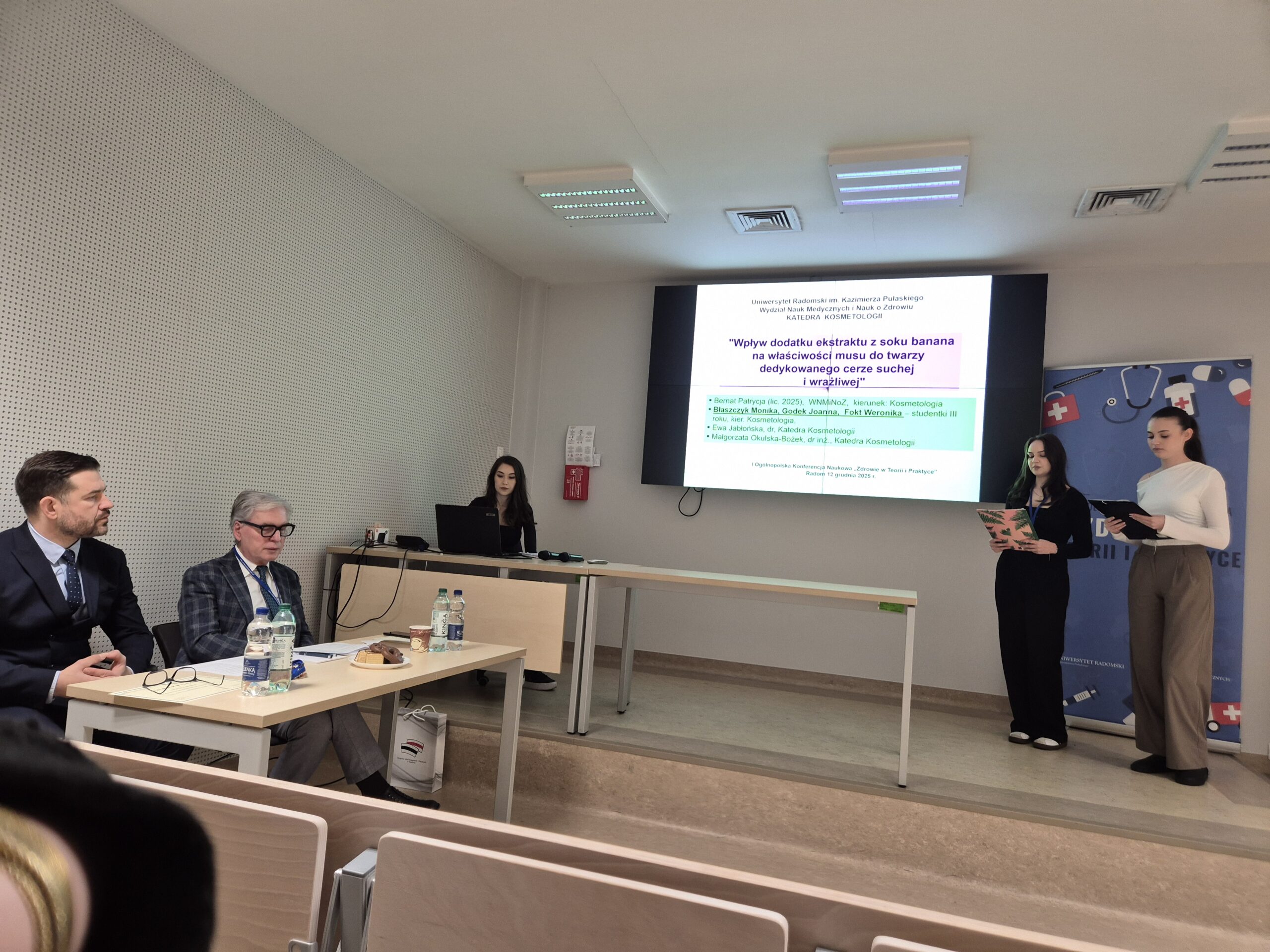 W dniu 12.12.2025r. Pracownicy Katedry Kosmetologii oraz Studentki kierunku Kosmetologia aktywnie uczestniczyli w I Ogólnopolskiej Konferencji Naukowej „Zdrowie w Teorii i Praktyce” organizowanej przez Wydział Nauk Medycznych i Nauk o Zdrowiu, Uniwersytetu Radomskiego. Konferencja odbyła się między innymi pod patronatem Jego Magnificencji Rektora Uniwersytetu Radomskiego prof. dr hab. Sławomira Bukowskiego. Przewodniczącym Komitetu Naukowego był Dziekan Wydziału Nauk Medycznych i Nauk o Zdrowiu dr hab. Ryszard Tomasiuk, prof. URad. Natomiast Przewodniczącym Komitetu Organizacyjnego był dr Piotr Jaworski. Celem konferencji było wspólne poszukiwanie odpowiedzi na najważniejsze wyzwania współczesnej medycyny i zdrowia publicznego poprzez stworzenie przestrzeni do wymiany doświadczeń, prezentacji wyników badań naukowych, merytorycznych dyskusji oraz wzajemnych inspiracji, sprzyjających nawiązywaniu współpracy pomiędzy różnymi środowiskami medycznymi i naukowymi. Studentki kierunku Kosmetologia: Błaszczyk Monika, Godek Joanna, Fokt Weronika, Bernat Patrycja, Wójcicka Oliwia, Wojtasik Amelia, Brusik Anna, pod opieką naukową dr inż. Małgorzaty Okulskiej oraz dr Ewy Jabłońskiej wygłosiły dwa referaty naukowe pt.: „Wpływ dodatku ekstraktu z soku banana na właściwości musu do twarzy dedykowanego cerze suchej i wrażliwej” oraz „Wpływ dodatku wyciągu z nasion kasztanowca na wybrane właściwości fizykochemiczne i użytkowe masek przeznaczonych do pielęgnacji cery naczynkowej”. Na konferencji został zaprezentowany również poster naukowy pt. „Skuteczność witaminy C w formie SAP w redukcji przebarwień posłonecznych” autorstwa dr inż. Katarzyny Sarny oraz Karoliny Hebdy.