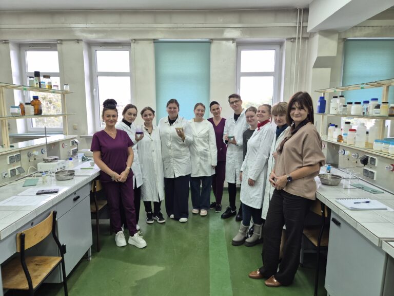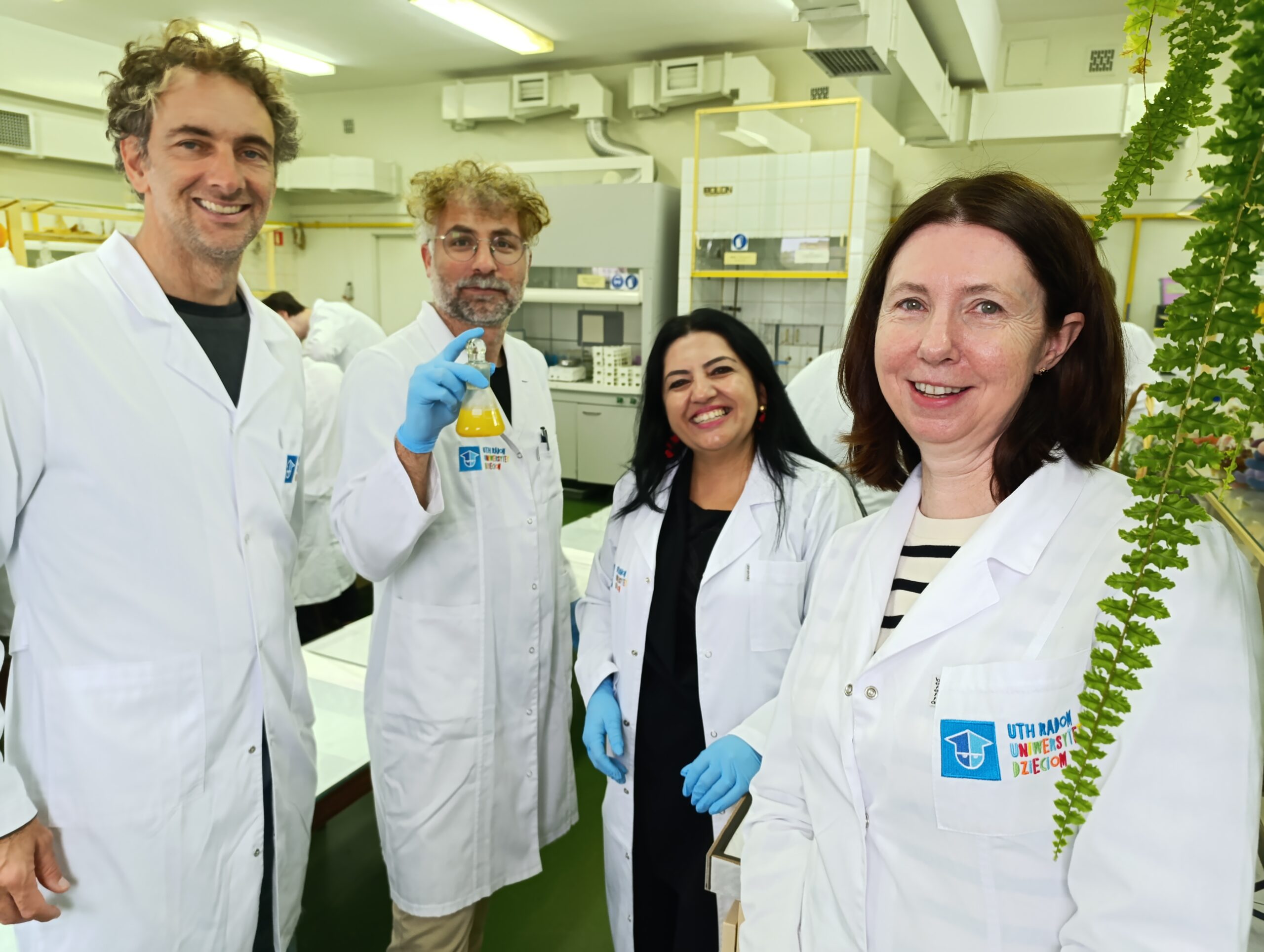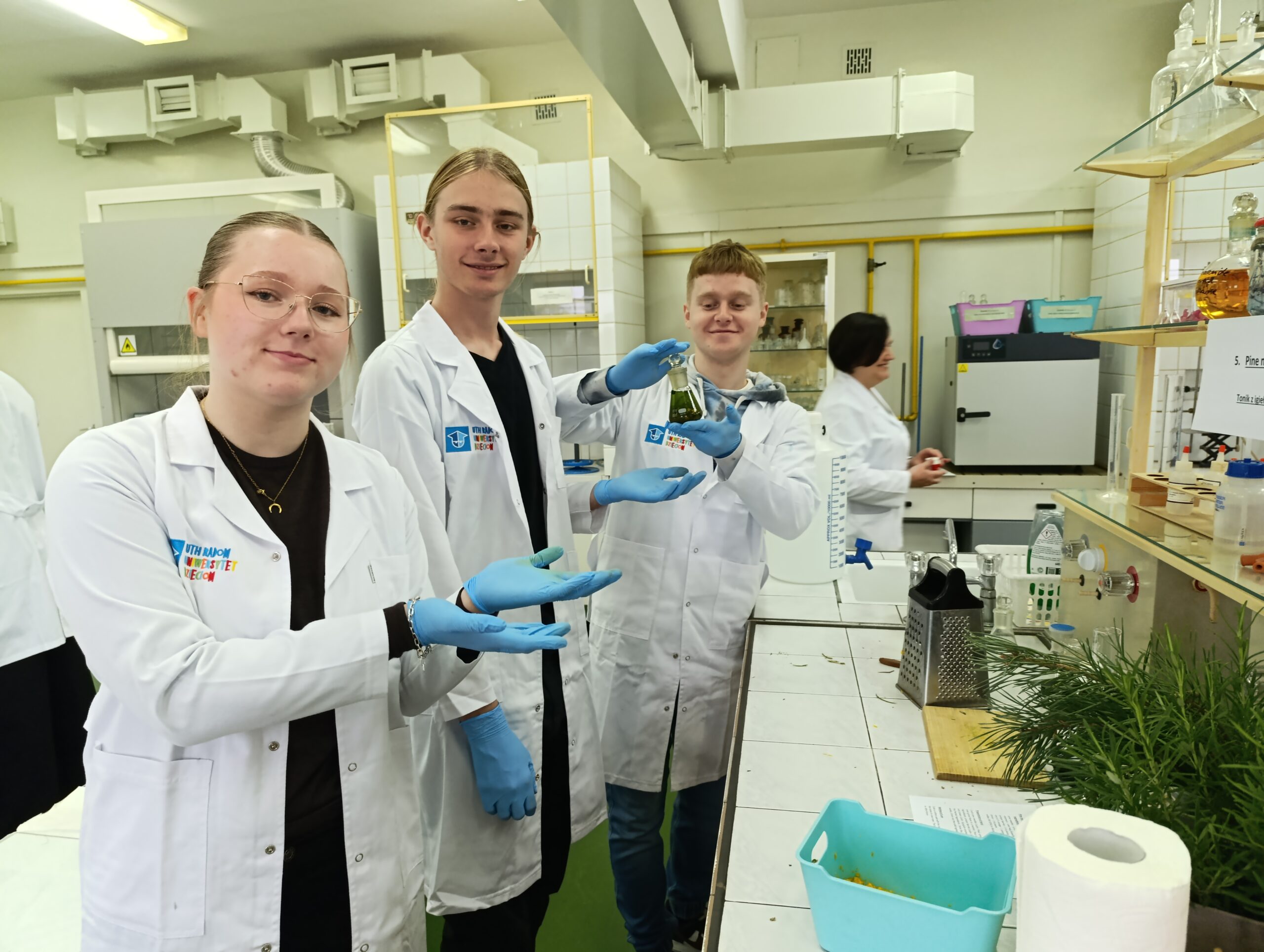 W dniu 29 września 2025r. Katedra Kosmetologii gościła grupę siedmiu Studentów z kierunku nauczycielskiej chemii z Constantine the Philosopher University in Nitra (Słowacja) wraz z opiekunem doc. Ing. Melánia Feszterová, PhD. Wizyta odbyła się w ramach programu Erasmus+ z Wydziału Filologiczno-Pedagogicznego, którego koordynatorami były Pani Prorektor, dr hab. inż. Elżbieta Sałata, prof. URad. oraz Pani Prodziekan. dr Justyna Bojanowicz, prof. URad. Dla Studentów przygotowano laboratoryjne warsztaty z formulacji kosmetycznych. Studenci wraz z Prowadzącymi (dr hab. inż. Emilią Klimaszewską, prof. URad. i dr inż. Martą Ogorzałek) wytworzyli produkty kosmetyczne: żel pod prysznic oraz krem do rąk, poznając surowce kosmetyczne oraz procedury recepturowania. Następnie, Studenci mieli możliwość pogłębienia wiedzy z zakresu trychologii oraz diagnostyki skóry twarzy w pracowniach kosmetologicznych pod bacznym okiem Pani kosmetolog, dr inż. Katarzyny Sarny.