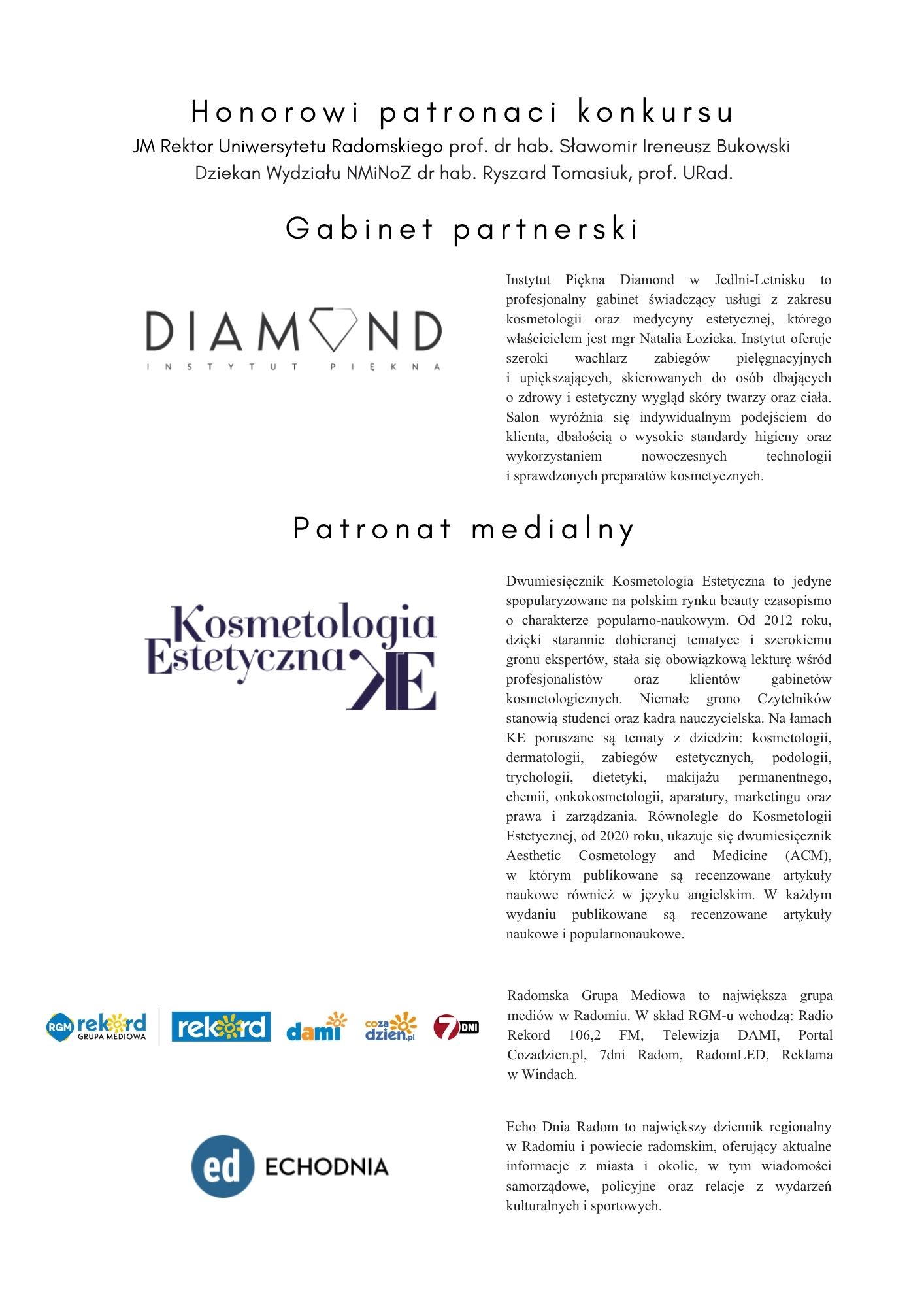 Dnia 22.04.2026 r. w murach Uniwersytetu Radomskiego im. Kazimierza Pułaskiego, Wydziału Nauk Medycznych i Nauk o Zdrowiu odbędzie się I Ogólnopolski Konkurs Makijażu Art and Beauty pt. „Wiosna w Paryżu”, pod patronatem JM Rektora, prof. dr hab. Sławomira Bukowskiego i Dziekana Wydziału NMiNoZ dr hab. n. med. Ryszarda Tomasiuka, prof. URad. oraz opieką kosmetologiczną Instytutu Piękna Diamond. Pomysłodawczyniami oraz opiekunami przedsięwzięcia są dr n. med. i n. o zdr. Marlena Warowna oraz mgr Sylwia Jagielska, natomiast koordynatorami dr hab. inż. Emilia Klimaszewska, prof. URad. i dr inż. Marta Ogorzałek z Katedry Kosmetologii Wydziału WNMiNoZ. Konkurs makijażu skierowany jest do studentów i ich opiekunów z kierunku kosmetologia z Uczelni publicznych i niepublicznych z całej Polski. Ponadto przewidujemy również panel wykładowy, którego prelegentami będą specjaliści z branży kosmetologicznej oraz ze świata nauki. Laureaci konkursu otrzymają wiele cennych nagród w postaci akcesoriów kosmetycznych, bonów na odzież kosmetyczną, zestawów kosmetyków pielęgnacyjnych i kolorowych, voucherów na szkolenie specjalistyczne, jak również biokominków. W skład jury będą wchodzić osoby związane ze sztuką makijażu. Miejsce przewodniczącej jury zajmie Pani Milena Tomkowska – mistrzyni Świata i Polski w makijażu. Patronat medialny przedsięwzięcia objęło czasopismo branżowe Kosmetologia Estetyczna jak również Echo Dnia i Radomska Grupa Mediowa. Sponsorami finansowymi oraz sponsorami nagród rzeczowych i usług są liczne fimy: Moto Vibe, Saute Nails, Elmo Taxi, Bodetko Lash, oraz Stowarzyszenie Przeszłość-Przyszłości, Falicea, Inglot, Apollca, Make-up Atelier Paris, Glamtes, Hulu, Clarena, Vanity, Jadwiga, MedEstelle, Fenice Dermatology & Aesthetic Medicine, LVY Cosmetics, Victoria VYNN, Many Beauty, MK Studio & Academy, White Scrubs, 4MASS, Manilu, Eldan, Galeria Konopi, Kami, Kratki, Cukiernia Słupek, Azalia, Bueno Catering. Rejestracja trwa do 17.04.2026 r.